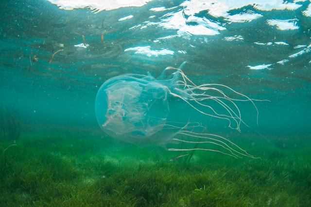 ビーチでクラゲなどの毒性生物が入り込まないようなネットの設置を行います。